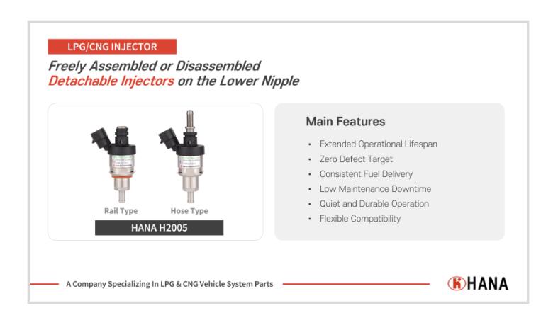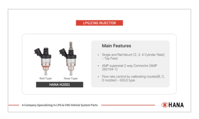HANA EMS, is a renowned company that produces high-quality CNG and LPG injectors for gas vehicle system, promoting cleaner fuels like CNG and LPG, reducing pollution, and promoting eco-friendly and sustainable driving practices instead of regular gasoline or diesel. The HANA H2001 is a top-feed injector designed for passenger vehicles, offering flexible installation options. It can be a single hose-type injector or a rail-type injector, supporting combinations of 2, 3, or 4 cylinders using aluminum or plastic rail asse…
