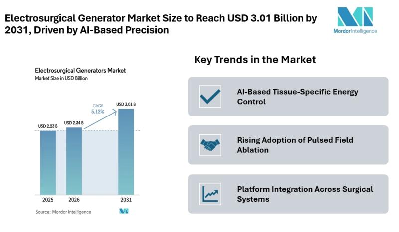 According to Mordor Intelligence, the electrosurgical generator market size [https://www.mordorintelligence.com/industry-reports/electrosurgical-generators-market?utm_source=abnewswire] is estimated at USD 2.34 billion in 2026, growing from USD 2.23 billion in 2025, and projected to reach USD 3.01 billion by 2031, at a CAGR of 5.12% du…