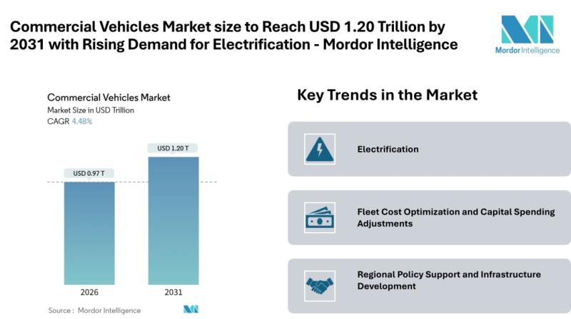 According to Mordor Intelligence, the commercial vehicles market size [https://www.mordorintelligence.com/industry-reports/commercial-vehicle-market?utm_source=abnewswire]was valued at USD 0.97 trillion in 2026 and is expected to reach USD 1.20 trillion by 2031, registering a CAGR of 4.48% during the market forecast period.
