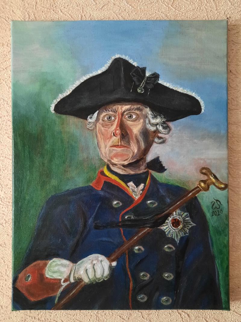 In this painting, beneath the oil on canvas lies a painstaking attempt to accurately recreate the famous portrait of Frederick the Great (1870) by Wilhelm Camphausen. It follows the original composition, conveying the solemnity, authority, and psychological intensity of Frederick the Great with historical precision.