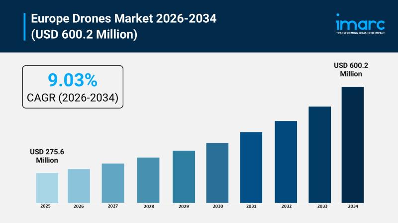 • The Europe drones market size reached USD 275.6 Million in 2025.