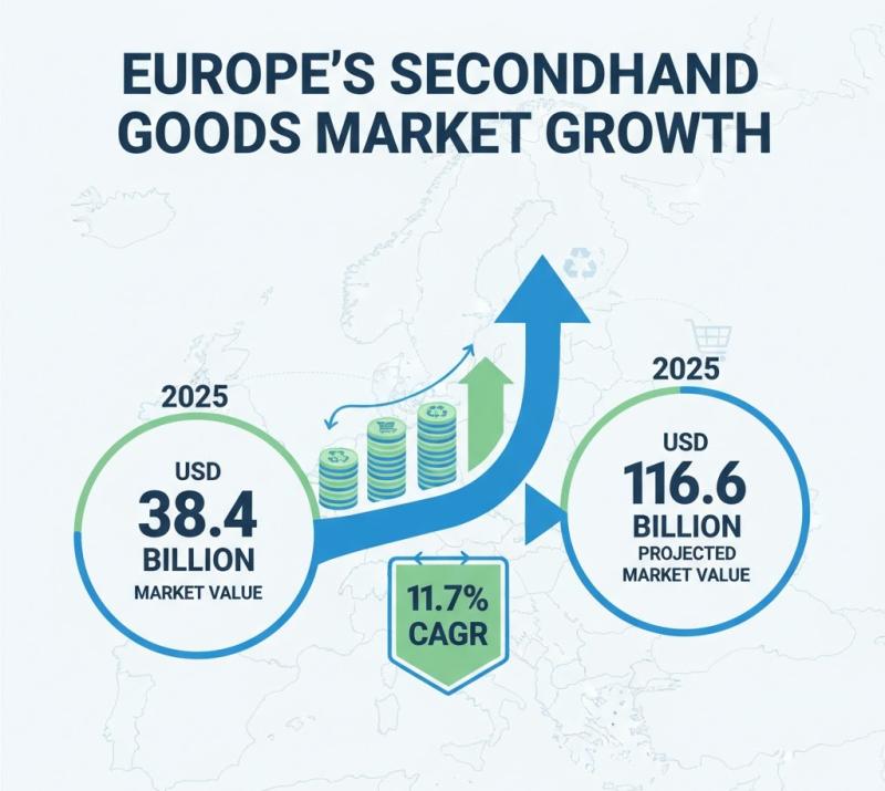 The Europe Secondhand Goods Market is set to witness a transformative decade, projected to grow from USD 38.4 billion in 2025 to USD 116.6 billion by 2035, registering an impressive CAGR of 11.7%, according to the latest market analysis. Growth is propelled by inflation-led thrift behavior, the rise of digital resale ecosystems, and policy support for circular trade practices.