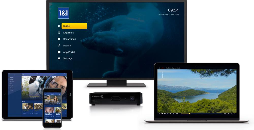 1&1 Digital-TV is based on the White Label IPTV Multiscreen Solution from ZATTOO, which is completely hosted and managed by ZATTOO. In addition to the ABOX42 set-top box, it also includes applications for Apple TV, Amazon Fire TV, iOS, Android and all major browsers and can be used via Google Chromecast. All front-end applications are branded with the 1&1 brand and logo and with the typical 1&1 look & feel.
