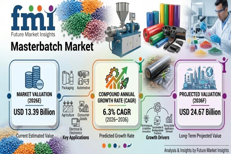 According to the latest analysis by Future Market Insights, the global masterbatch market is entering a phase of steady expansion, driven by rising demand for high-performance plastic additives across packaging, automotive, and consumer goods industries. The market is projected to grow from USD 13.39 billion in 2026 to USD 24.67 billion by 2036.