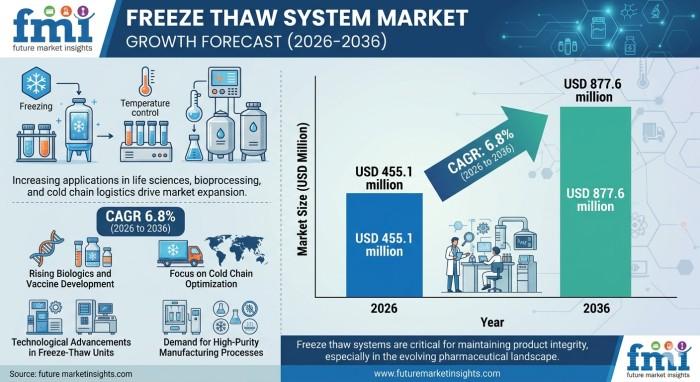 NEWARK, Del., USA | April 28, 2026 According to latest insights by Future Market Insights, the global freeze thaw system market is entering a steady growth phase as biologics manufacturing continues to scale globally. According to the latest analysis, the market is valued at USD 455.1 million in 2026 and is projected to reach USD 877.6 million by 2036, expanding at a CAGR of 6.8%. The sector is expected to…