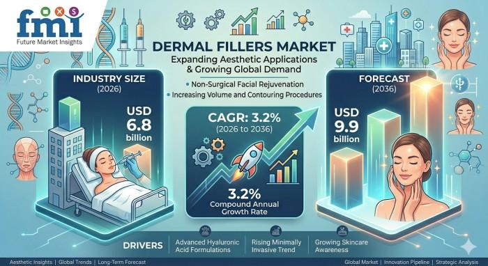 NEWARK, Del., USA | April 28, 2026 According to latest insights by Future Market Insights, the global dermal fillers market is witnessing steady expansion as aesthetic procedures become increasingly normalized across global populations. The market is valued at USD 6.8 billion in 2026 and is projected to reach USD 9.9 billion by 2036, expanding at a CAGR of 3.2%. The sector is expected to generate an incremental opportunity of USD…