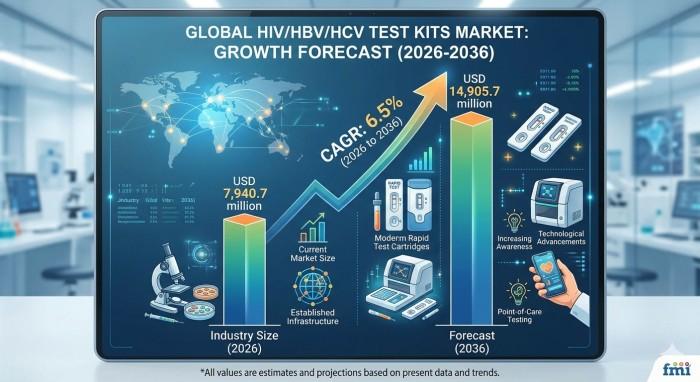 NEWARK, Del., USA | April 28, 2026 According to latest insights by Future Market Insights, the global HIV/HBV/HCV test kits market is entering a sustained growth phase as healthcare systems intensify infectious disease screening and expand early diagnosis programs. According to the latest analysis, the market is valued at USD 7,940.7 million in 2026 and is projected to reach USD 14,905.7 million by 2036, expanding at a CAGR of 6.5%.…