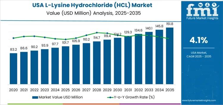 The USA L-lysine hydrochloride (HCL) market continues to demonstrate stable, structurally driven growth as animal nutrition optimization and health-focused dietary supplementation reinforce long-term demand. Valued at USD 101.7 million in 2025, national demand is projected to reach USD 151.8 million by 2035, expanding at a CAGR of 4.1%. Growth momentum reflects the essential role of lysine in protein synthesis, metabolic efficiency, and balanced nutrition across feed, food, and pharmaceutical applications.