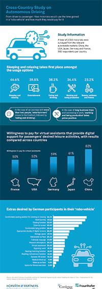 International comparative study on what people want from autonomous driving technologyAs part of a survey involving 2500 motorists in five major markets, management consultants Horváth & Partners worked together with the Fraunhofer IAO to determine respondents’ willingness to pay and desired interior configurations for self-driving vehicles. The results are summarized in the “Enabling the Value of Time” study.