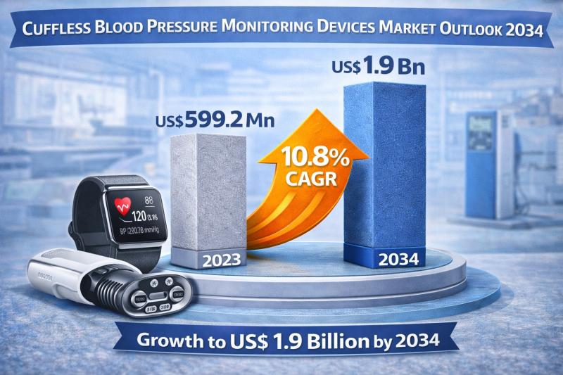 The global cuffless blood pressure monitoring devices market is gaining strong momentum as healthcare systems, clinicians, and consumers increasingly prioritize continuous, comfortable, and technology-driven health monitoring solutions. Valued at US$ 599.2 million in 2023, the market is projected to expand at a robust compound annual growth rate (CAGR) of 10.8% from 2024 to 2034, reaching an estimated US$ 1.9 billion by the end of 2034. This significant growth trajectory highlights…