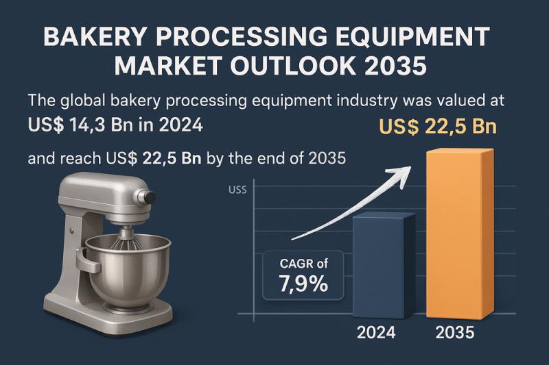 The bakery industry is undergoing a major technological and structural transformation. As global consumers increasingly crave convenient, high-quality, and specialty baked products, the Bakery Processing Equipment Market is witnessing significant expansion. Valued at US$ 14.3 billion in 2024, the market is projected to grow at a compound annual growth rate (CAGR) of 7.9% from 2025 to 2035, ultimately reaching US$ 22.5 billion by the end of the forecast period.
