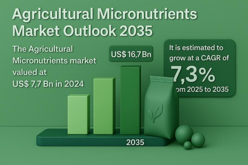 The global Agricultural Micronutrients Market, valued at US$ 7.7 billion in 2024, is projected to reach US$ 16.7 billion by 2035, expanding at a CAGR of 7.3% between 2025 and 2035, according to the latest market analysis. Growing global food demand, diminishing soil fertility, and increasing awareness about sustainable agriculture practices are key factors fueling market expansion.