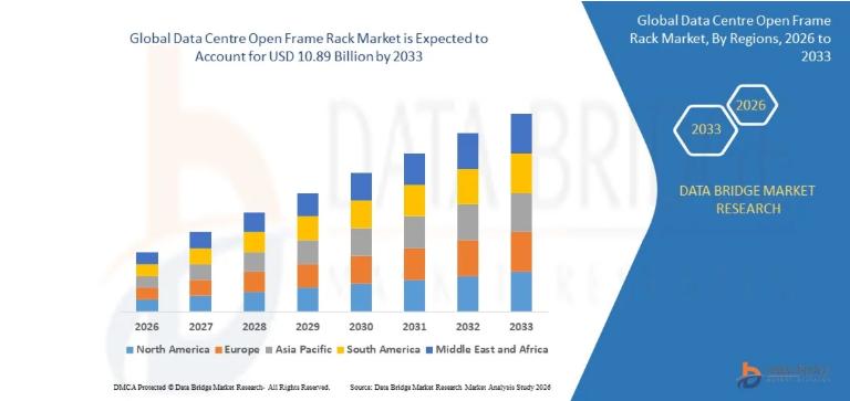 As per Data Bridge Market Research analysis, the data centre open frame rack market was estimated at USD 5.42 billion in 2025. The market is expected to grow from USD 5.91 billion in 2026 to USD 10.89 billion in 2033, at a CAGR of 9.10% during the forecast period with driven by the rising demand for scalable data center infrastructure, increasing cloud adoption, and expansion of hyperscale facilities globally.