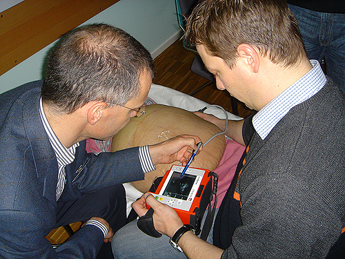 In the first part of hands-on training, participants have to perform the standardized procedure of abdominal ultrasound on both healthy volunteers and patient with intraabdominal diagnostic findings. In the second part of the hands-on training, participants learn how to perform the ultrasound procedure under time pressure. Furthermore they learn the usage in abnormal positions. Participants are given sufficient time to ask questions and to repeat the standardized procedure. In the third part of the training course, real time scenarios are presented with healthy or patient volunteers found in critical situations following an accident. These scenarios include surgical triage of the victims or volunteers trapped in the wreckage of a vehicle. The participants learn how to handle the ultrasound diagnosis devices within the scenarios. The ultrasound course is carried out using the portable ultrasound device PRIMEDICTM HandyScan manufactured by the company Metrax GmbH in Rottweil (Germany). The device is specially developed for emergency medical services.