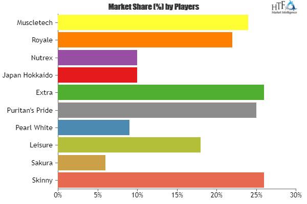 Some of key competitors or manufacturers included in the study are Skinny, Sakura, Leisure, Pearl White, Puritan's Pride, Extra, Japan Hokkaido, Nutrex, Royale & Muscletech
