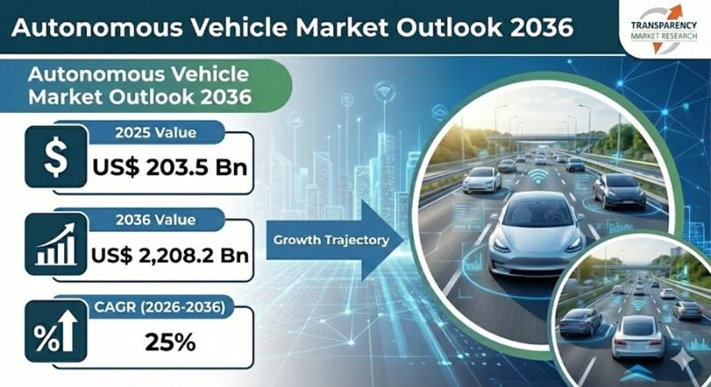 The global autonomous vehicle market is undergoing a historic transformation as automation, artificial intelligence, and advanced sensor technologies redefine the future of mobility. Valued at US$ 203.5 billion in 2025, the market is projected to surge to an exceptional US$ 2,208.2 billion by 2036, expanding at a remarkable CAGR of 25% from 2026 to 2036. This exponential growth reflects the rapid shift toward self-driving technologies across passenger vehicles, commercial fleets,…