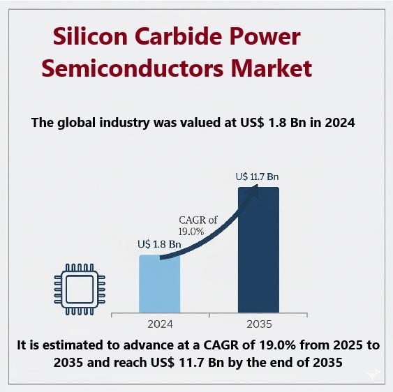The global silicon carbide (SiC) power semiconductors market is entering a transformative growth phase driven by the rising need for high-efficiency, compact, and energy-saving power electronics across industries. Valued at US$ 1.8 Bn in 2024, the market is projected to expand at an exceptional CAGR of 19.0% from 2025 to 2035, ultimately reaching US$ 11.7 Bn by 2035. This extraordinary growth trajectory reflects a global shift toward wide bandgap semiconductors…