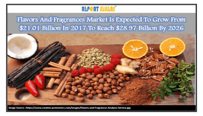 Report Sellers has added a new market research report “Flavors and Fragrances - Global Market Outlook (2017-2026)” to its offerings. The report is an in-depth market study providing accurate market insights including the latest trends, forecast, competitive insights, etc.According to the report, the Global Flavors and Fragrances market is expected to grow from $21.01 billion in 2017 to reach $28.97 billion by 2026 with a CAGR of 3.6%.