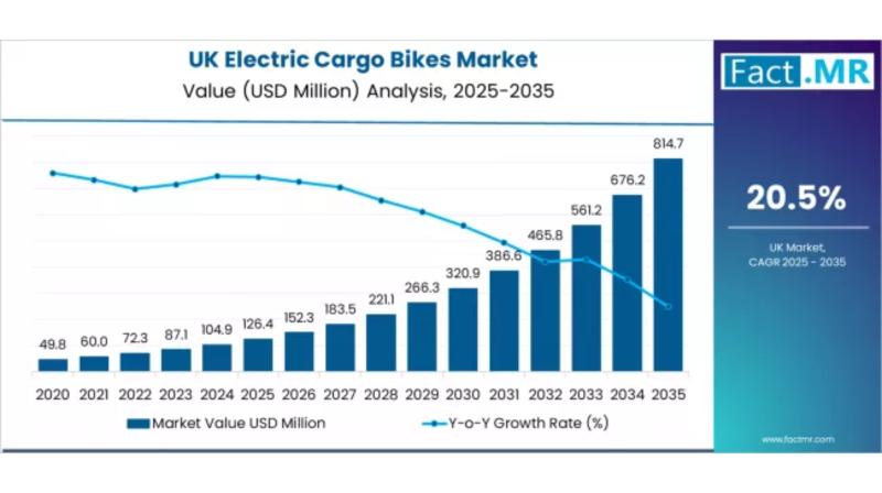 The UK electric cargo bike market is set for remarkable growth, driven by the rising need for sustainable, efficient, and zero-emission delivery solutions. According to a recent analysis by Fact.MR, the market is projected to expand from USD 126.4 million in 2025 to approximately USD 814.7 million by 2035, reflecting a robust compound annual growth rate (CAGR) of 20.5% during the forecast period. Electric cargo bikes-designed for commercial and personal transportation-are
