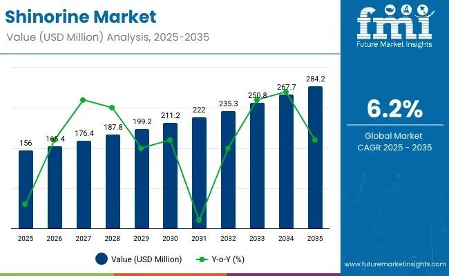 The global shinorine market, valued at USD 156.0 million in 2025, is projected to reach USD 284.2 million by 2035, growing at a 6.2% CAGR, driven by the rising adoption of natural UV-protective compounds across cosmetics, pharmaceuticals, and marine biotechnology sectors. The decade-long expansion reflects both steady biotechnology advancements and growing consumer preference for naturally derived bioactives in skincare and health applications.