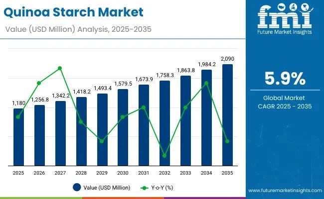 The global quinoa starch market is witnessing robust growth, valued at USD 1,180 million in 2025 and projected to reach USD 2,090 million by 2035, expanding at a CAGR of 5.9%. Growth is propelled by the rising popularity of gluten-free foods, consumer preference for natural functional ingredients, and the increasing demand for high-performance starch alternatives in food processing.