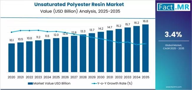 The global unsaturated polyester resin (UPR) market is poised for steady expansion over the next decade, rising from USD 12.0 billion in 2025 to USD 16.8 billion by 2035, reflecting a CAGR of 3.4%, according to the latest research from FactMR.