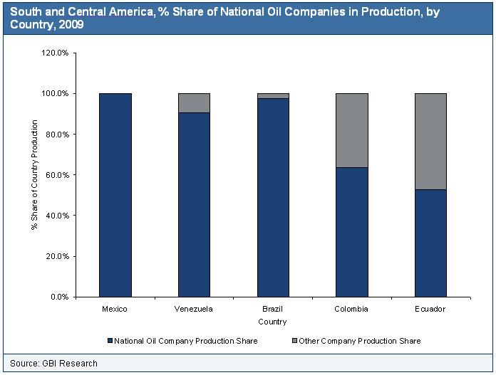 National Oil Companies (NOCs) dominate the upstream sector in Mexico, Brazil and Venezuela, with these three countries together accounting for approximately 91% of the total oil and gas reserves in the region. NOCs in these countries account for over 90% of the oil production in each country. The NOCs in Colombia and Ecuador also accounted for more than 50% of the total oil produced. NOCs will continue to dominate the energy sector in their respective countries with support from their national governments. Major South and Central American countries help them to dominate the upstream sector.