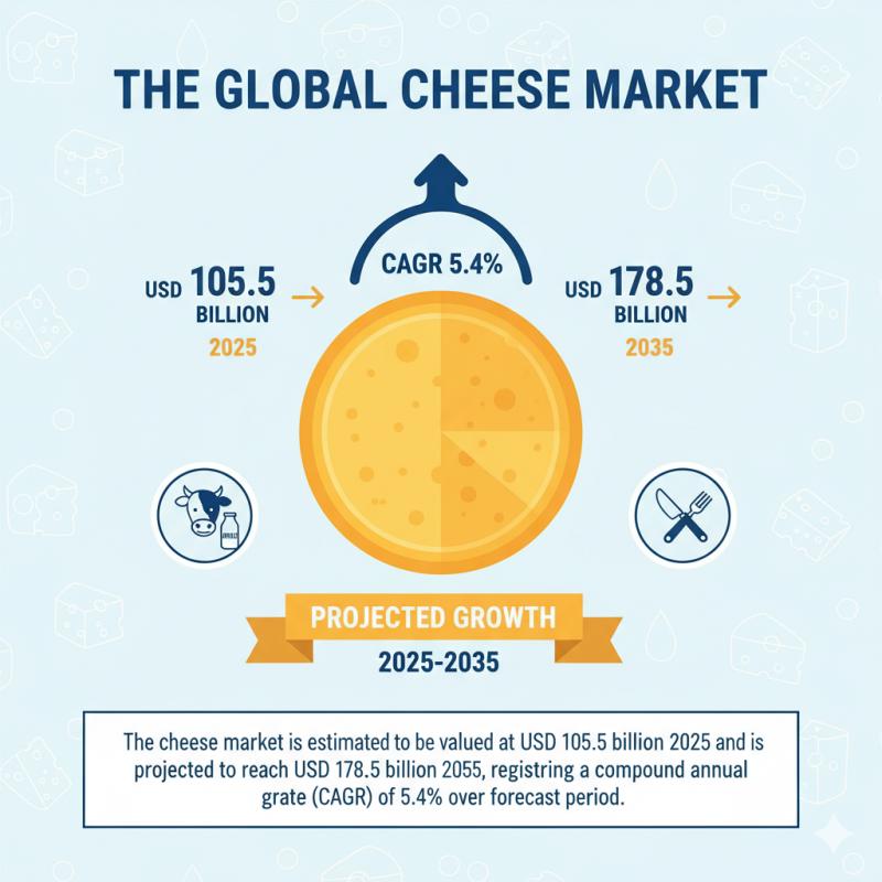 The global cheese market is estimated at USD 105.5 billion in 2025 and is projected to reach USD 178.5 billion by 2035, registering a steady CAGR of 5.4% throughout the forecast period. Strong demand across developed and emerging economies, rising consumption of protein-rich foods, and expanding applications in foodservice continue to drive momentum.
