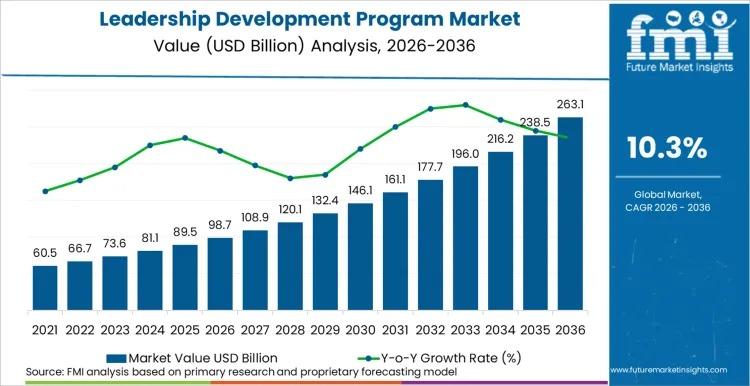 The global Leadership Development Program Market is projected to grow from USD 98.7 billion in 2026 to USD 263.1 billion by 2036, registering a robust CAGR of 10.3%. This expansion reflects a structural shift in how enterprises view leadership training - from discretionary HR spending to a measurable performance investment tied directly to succession pipelines, digital transformation, and workforce resilience.