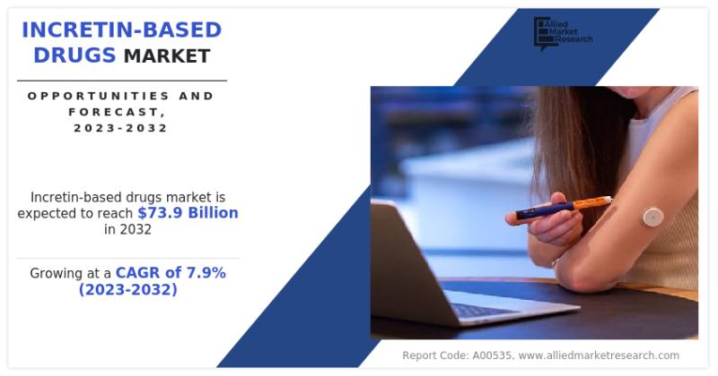 According to a report published by Allied Market Research, titled "Incretin-based Drugs Market by Drug Class, Route of Administration, and Distribution Channel: Global Opportunity Analysis and Industry Forecast, 2023-2032," the market was valued at USD 34.4 billion in 2022 and is projected to reach USD 73.9 billion by 2032, registering a CAGR of 7.9% during the forecast period.