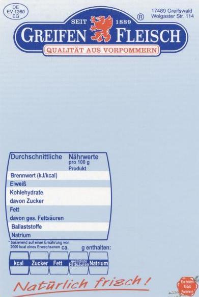 With the help of the Bizerba GLM-I and GLP labelling machines the customer will be able to print details as to the nutritional value, the contents, special offers and the packaging date on the printable areas by himself. Marc Büttgenbach, the Sales Manager for Labels and Consumables at Bizerba, explains the advantages for the food trade: “The fact that only one label is required from now on reduces on the one hand, the operating costs for the storage of several kinds of labels and on the other hand, there are no more changeover times for the exchanging of labels during product changes and labelling mistakes are also a thing of the past. This way it is no longer possible that a ham label is applied to Salami. In addition the customer can order the universal label in substantial quantities and thereby save even more.” The sample label is from the company Greifenfleisch in Greifswald, a producer of high-quality meat and sausage products.