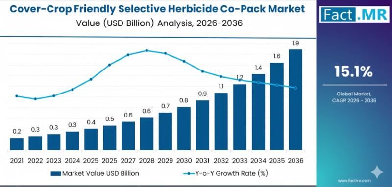 The global cover-crop friendly selective herbicide co-pack market is emerging as one of the fastest-growing segments within sustainable agrochemicals, driven by the increasing adoption of regenerative farming, no-till systems, and soil-health-focused crop management. The market is valued at approximately USD 0.5 billion in 2026 and is projected to reach USD 2.0 billion by 2036, registering a robust compound annual growth rate (CAGR) of 15.1% over the ten-year period.