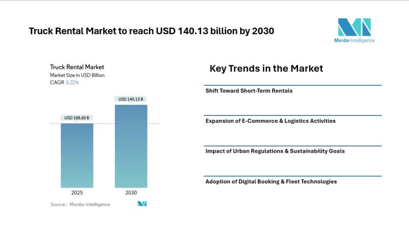 The truck rental market size stands at USD 108.65 billion in 2025 and is forecast to reach USD 140.13 billion by 2030, advancing at a 5.22% CAGR, supported by steady demand across logistics, construction, retail distribution, and household moving activities.