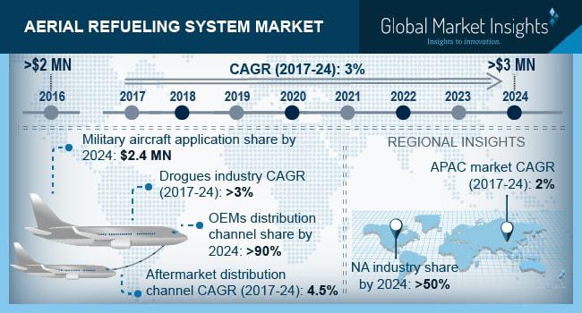 Aerial Refueling System Market size is estimated to surpass USD 3 million by 2024; according to a new research report by Global Market Insights, Inc. Probe and drogue will dominate the aerial refueling system market, crossing 70% volume share over the forecast timespan. Provision of more passive tanker operations as compared to flying boom mechanism along with negligible requirement of precise direction to the drogue will contribute significantly towards the revenue generation. Flying boom system will witness significant gains owing to its high usage in the industry over the past years. Moreover, high fuel transferring rate as compared to the counterpart will further propel the market size from 2017 to 2024.Sample Copy of This Report @ https://www.gminsights.com/request-sample/detail/2155