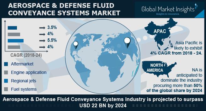 Aerospace & Defense Fluid Conveyance Systems Market size is estimated to surpass USD 22 billion by 2024; according to a new research report by Global Market Insights, Inc. Commercial aircrafts will dominate the aerospace & defense fluid conveyance systems market with more than 80% share over the forecast timeframe. This can be attributed to their continuously rising production. In addition, substantial production rates of popular aircrafts such as B787, B737, A320 family, A350XWB, etc. will further support the industry dominance. Regional jets will exhibit over 5.5% CAGR till 2024 owing to rising investments in aviation industry coupled with provision of optimized capacity by these jets.Sample Copy of This Report @ https://www.gminsights.com/request-sample/detail/2518
