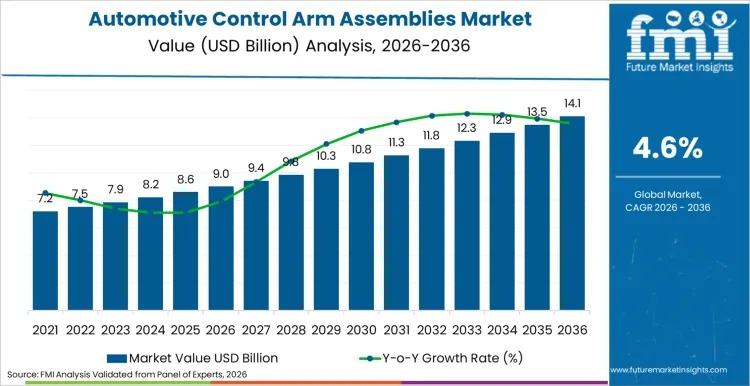 The global automotive control arm assemblies market is projected to grow at a CAGR of 4.6% between 2026 and 2036, increasing from USD 9.0 billion to USD 13.6 billion. This steady expansion reflects the structural transformation underway in global suspension systems, where manufacturers are transitioning from conventional stamped steel designs toward multi-material engineered assemblies that improve vehicle handling, ride comfort, and structural durability.