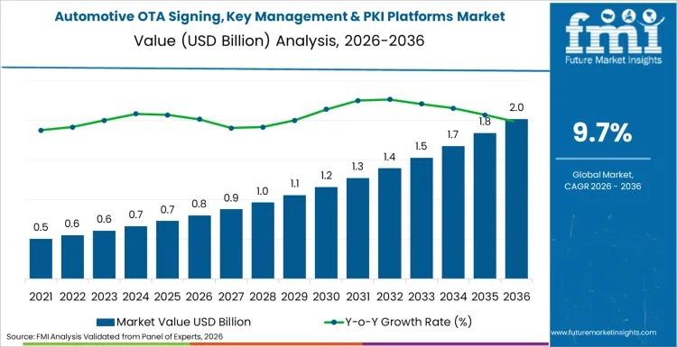 The global automotive OTA signing, key management & PKI platforms market is projected to grow from USD 0.8 billion in 2026 to USD 2.1 billion by 2036, advancing at a compound annual growth rate (CAGR) of 9.7%, according to the latest analysis by Future Market Insights (FMI). This strong growth trajectory reflects a structural transformation in automotive cybersecurity, as vehicle manufacturers transition from hardware-centric security modules toward software-defined vehicle architectures…