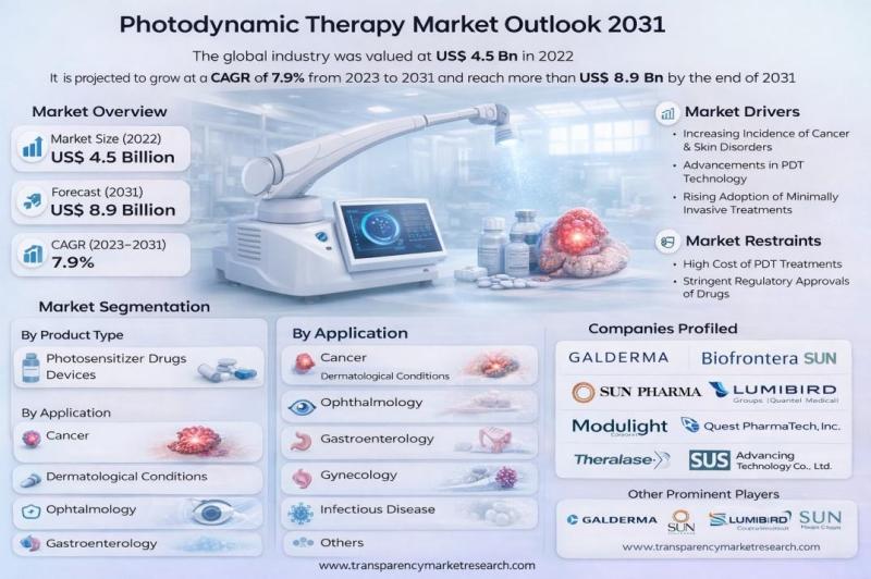 The global photodynamic therapy (PDT) market was valued at US$ 4.5 Billion in 2022 and is projected to grow at a compound annual growth rate (CAGR) of 7.9% from 2023 to 2031, reaching more than US$ 8.9 Billion by the end of 2031. Market growth is driven by increasing clinical validation of PDT, rising adoption of minimally invasive procedures, and expanding applications across oncology, dermatology, and other medical specialties.
