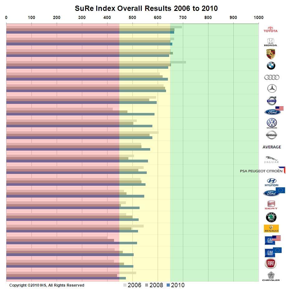 Toyota’s pole position is challenged by another Japanese OEM, Honda, while Porsche occupies the third spot in the 2010 SuRe index. Ford North America is the outlier in a ranking which has been traditionally tiered in four areas with the Japanese carmakers dominating it, followed by German premium OEMs, European mass carmakers and the Big Three at the bottom. Ford now occupies the eighth spot, representing a substantial improvement over last place in the 2006 edition of the study. Volkswagen chases Ford for the eighth position.