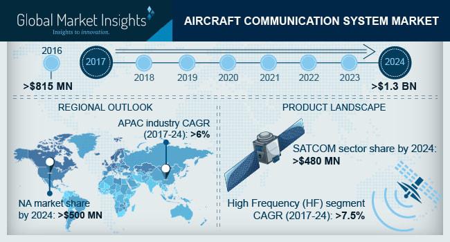 Aircraft Communication System Market size is estimated to surpass USD 1.3 billion by 2024; according to a new research report by Global Market Insights, Inc. Increasing implementation of advanced technologies coupled with growing aviation industry will primarily drive the aircraft communication system market size. Multiple developing countries in the world are witnessing an increase in air passenger traffic owing to affordable prices. This has resulted in substantial rise in aircraft deliveries from various manufacturers, further propelling the industry growth over the next eight years.