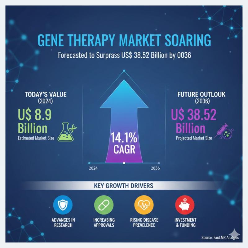 Gene Therapy Market Outlook, Forecasted to Surpass US$ 38.52 Billion by 2036 with a 14.1% CAGR. The global gene therapy market is calculated at a value of US$ 10.34 billion in 2026, driven by an increasing focus on healthcare research and the rising prevalence of rare diseases. Expanding at a compound annual growth rate (CAGR) of 14.1%, the market is projected to experience a significant surge, reaching a valuation of