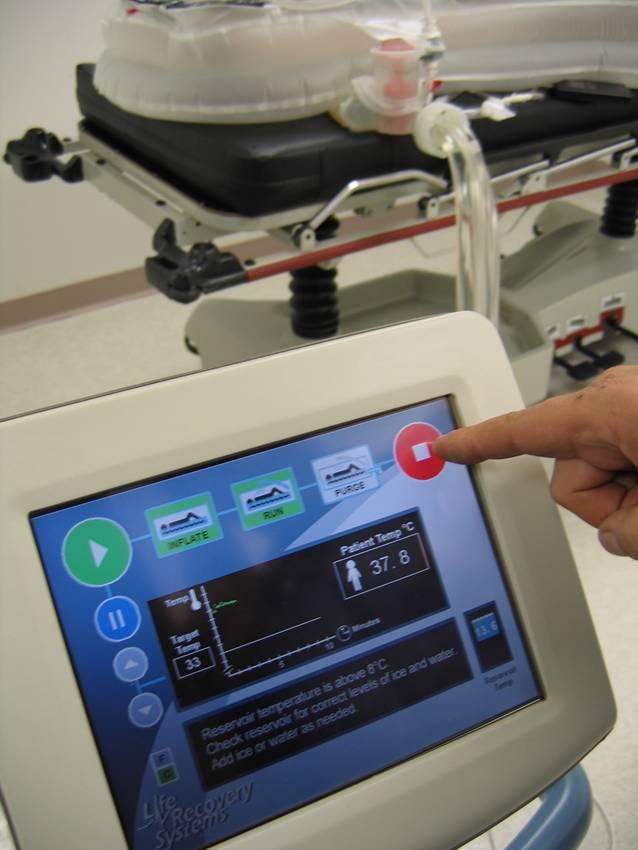 The ThermoSuit System is the only product that utilizes the highly efficient approach of direct contact liquid convection to cool patients. The device features a lower blanket with a soft porous lining that minimizes pressure points on the skin and enables free flow of coolant beneath the patient. A top sheet cools from above, and this includes a Velcro® closure that enables easy access to the patient during the cooling process. The computer-controlled pumping and temperature monitoring system includes a touch-screen user interface with a message panel to guide the user though the feedback-controlled cooling process. The system can be set up in less than 10 minutes by nurses and does not require catheterization. The ease of setup, rapid cooling, and safety of the ThermoSuit System are making it the cooling device of choice in a growing number of hospitals in the U.S.