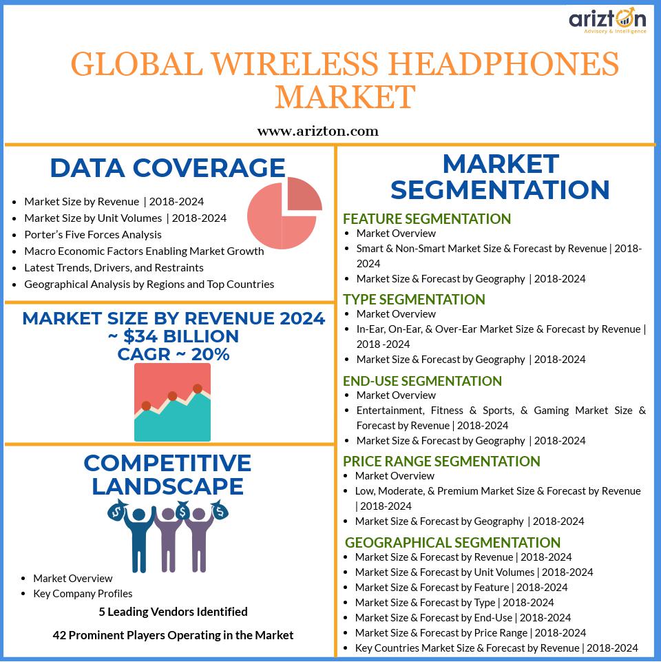 Arizton's market research report on the global wireless headphones market offers analysis on market size & forecast, market share, industry trends, growth drivers, and vendor analysis. The market study also includes insights on segmentation by feature (smart and non-smart), by type (in-ear, on-ear, and over-ear), by price range (low, moderate, and premium), by end-use (entertainment, fitness & sports, and gaming), and by geography (APAC, Europe, North America, Latin America, and MEA).The global wireless headphones market size is expected to generate revenues of approximately $34 billion by 2024, growing at an impressive CAGR of around 20% 2018–2024.