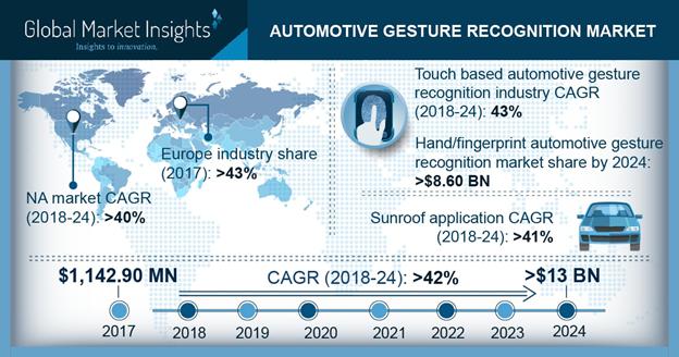 Multimedia, navigation and infotainment applications will witness robust growth of around 44% CAGR from 2018 to 2024. Rising trend towards customer comfort and advanced driving experience are the key features boosting the product demand. Moreover, cabin monitoring through simple gestures, avoiding distraction and reducing the probabilities of accidents will further propel the automotive gesture recognition market growth.