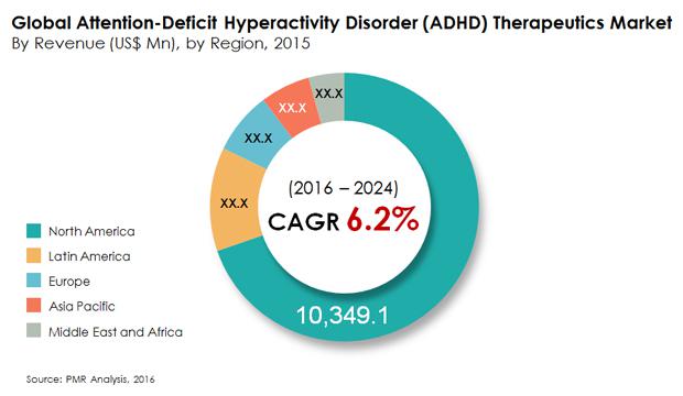 This report assesses trends driving each market segments and sub-segments and offers analysis and insights into the potential of ADHD therapeutics therapies in specific regions. North America is estimated to dominate the global ADHD therapeutics market, with a maximum value share of the overall market by the end of 2016. By 2024, North America and Europe markets are expected to account for over four-fifths share of the global ADHD therapeutics market revenue. In terms of value, North America is estimated to be the dominant market, registering a CAGR of 5.9% over the forecast period.