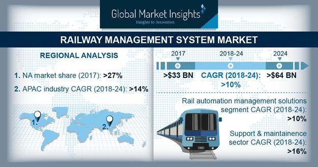 Railway Management System Market to exceed USD 64 billion by 2024; according to a new research report by Global Market Insights, Inc.The railway management system market growth is attributed to the increasing adoption of IoT and digitalization in the railway industry. IoT allows the rail operators to have proper information about the train’s location with respect to other trains to ensure passengers’ safety. It also automatically regulates the trains speed on the basis of real-time information, in turn, reducing the chances of collision driving their adoption in the railway management system market. The deployment of digital technologies in railways enhances the customer experience by delivering value-added services to its customers, increasing reliability, safety, efficiency, and the overall performance of the railways driving market growth.