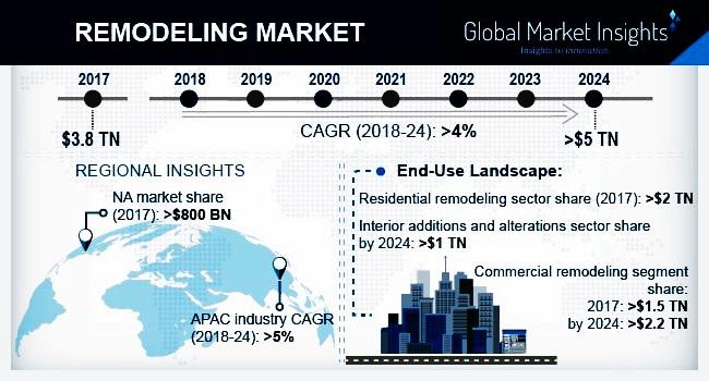 Residential remodeling market is expected to witness a CAGR of over 4% during the forecast period 2018 to 2024. Higher count of house gatherings along with rising consumer spending in developing economies will enhance the application market. Technological advancements providing better energy efficiency, enhanced designs, and highly durable materials along with need to increase the house security will drive the business growth globally. Increasing real estate prices in highly populated cities accompanied by the need for improved house space and design will support the services penetration.Lower lending rates along with design innovations will primarily drive the global remodeling market growth. Increasing private infrastructural investments along with favorable government conditions offering tax concessions on home loans will enhance the services demand.