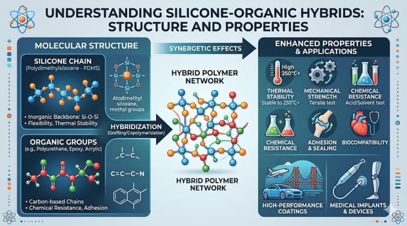 Silicone organic hybrids are advanced materials combining silicone-based compounds with organic polymers to create multifunctional properties. These hybrids offer enhanced flexibility, thermal stability, chemical resistance, and durability compared to traditional materials. They are widely used in coatings, electronics, automotive, and healthcare applications, providing improved performance and sustainability. Their unique molecular structure allows customization for specific industrial and technological requirements.