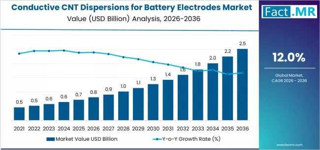 The Conductive Carbon Nanotube (CNT) Dispersions for Battery Electrodes market is undergoing a profound transformation driven by surging demand for next‐generation energy storage systems, sustainability requirements, and rapid material innovation. The market is projected to grow from USD 0.81 billion in 2026 to USD 2.5 billion by 2036, registering a Compound Annual Growth Rate (CAGR) of 12.0% through the decade.