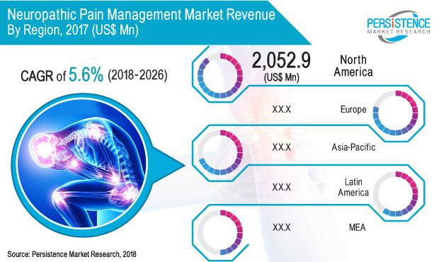 On the basis of region, the market has been segmented into North America, Latin America, Europe, Asia Pacific, and Middle East & Africa. This report assesses trends driving each market segment and offers analysis and insights into the potential of neuropathic pain management in specific regions. North America is estimated to dominate the global neuropathic pain management market with maximum value share of the overall market by the end of 2017. The North America neuropathic pain management market is estimated to increase at a CAGR of 5.8% through 2026. Emergence of several regional market players, a robust distribution network, and well-developed healthcare infrastructure in North America are some of the key factors driving the revenue growth of the neuropathic pain management market in North America.